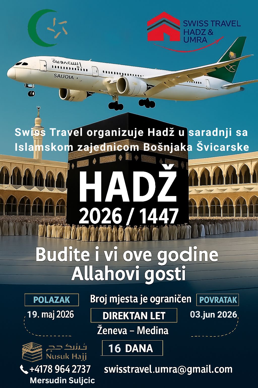 As-salamu Alaykum Merhaba Grüezi Letzte Beiträge Hadž 2026 06/10/2025 19.11.2025 – Bosnien 30 Jahre nach Dayton 05/10/2025 Predavanje Doručak – svake Nedelje (sabah Namaz) 04/10/2025 Umra 2026 – Decembar – Swiss Travel 04/10/2025 Sakupljance Odjeće 28/09/2025 Alle Beiträge