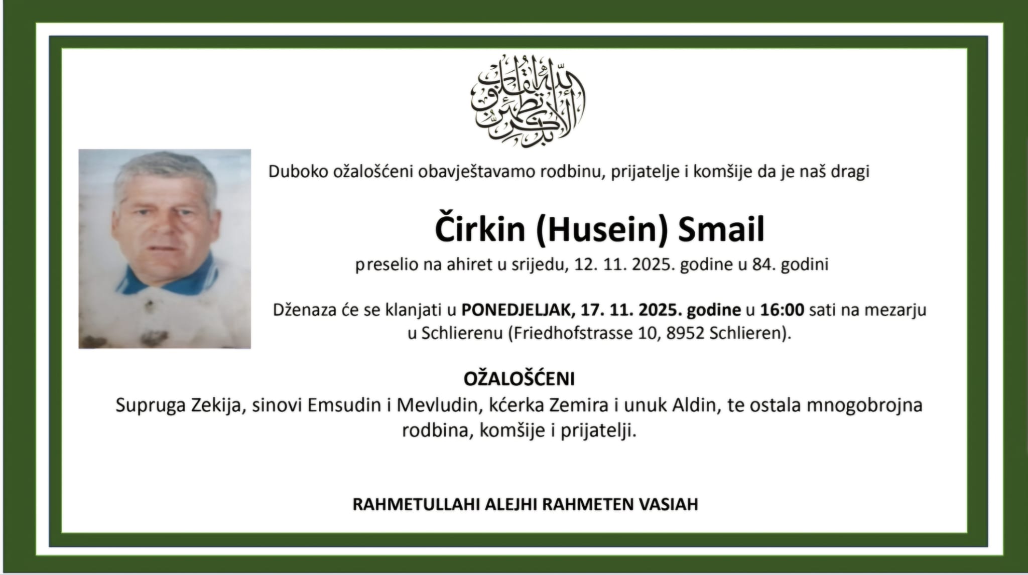 As-salamu Alaykum Merhaba Grüezi Posljednje objave Doc. dr. Admir Muslija i Dr. Jusuf Mehić – 6.12.2025 28/11/2025 Mubarek Dan Državnosti 25/11/2025 Muftija Nedžad Grabus na Svečanoj Godišnjici: „Budite Ponosi“ 24/11/2025 33. godišnjica IBC Cirih 20/11/2025 Preselio Čirkin (Husein) Smail 16/11/2025 Alle Beiträge