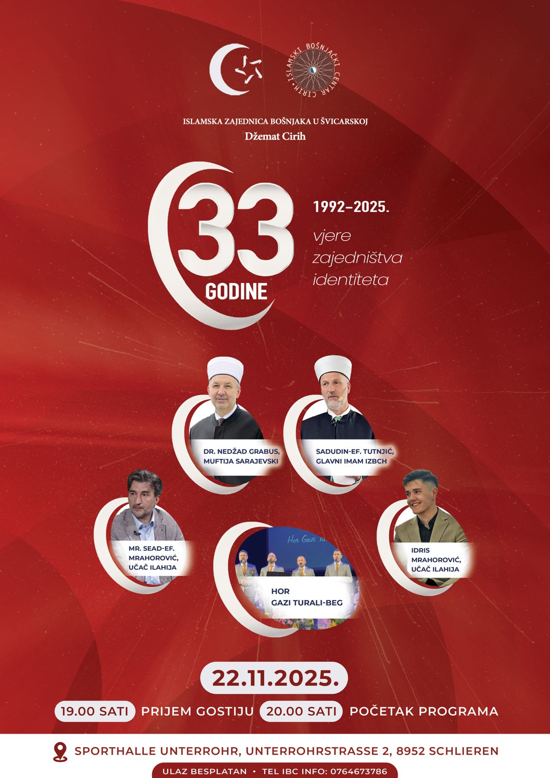 As-salamu Alaykum Merhaba Grüezi Posljednje objave 33. godišnjica IBC Cirih 20/11/2025 Hadž 2026 06/10/2025 19.11.2025 – Bosnien 30 Jahre nach Dayton 05/10/2025 Predavanje Doručak – svake Nedelje (sabah Namaz) 04/10/2025 Umra 2026 – Decembar – Swiss Travel 04/10/2025 Alle Beiträge