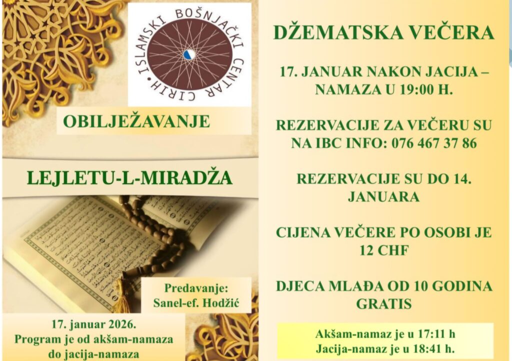 Esselamu alejkum poštovane džematlije i džematlijke. LEJLETU-L-MIRADŽ ćemo obilježiti, ako Bog da, 17. januara od akšama do jacije (iako je ova mubarek noć po takvimu dvije noći prije) a nakon jacije je džematska večera. Za večeru treba prijava na ovaj broj sa koga dobijate obavještenja. Dobro nam došli.